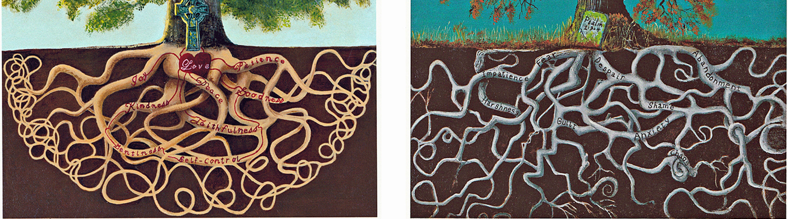 A couple months ago, a dear niece of mine gave me a quick drawing she did comparing 2 trees - one healthy, the other sick and dying. She labled the roots of each tree and how they impacted its growth - the diseased tree dying from the affects of a life lived for Self, while the healthy tree is nourished by the Fruit of the Spirit described in Galatians 5:22-23. She asked me to come up with a painting from her quick sketch. As I worked on it, I thought about Psalm 1 vs 3 says that a Blessed man "...is like a tree planted by streams of water that yields its fruit in its season, and its leaf does not wither." If you look carefully you'll see the contrasting elements in the roots and their affects on the trees health,